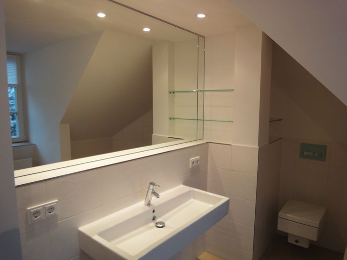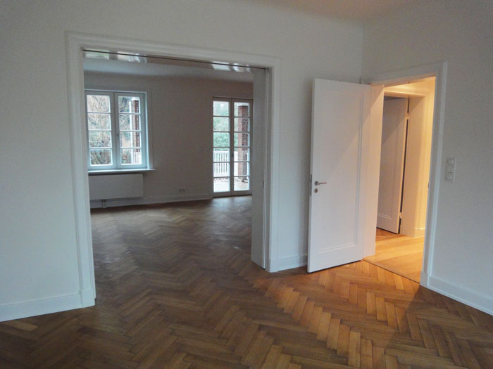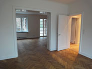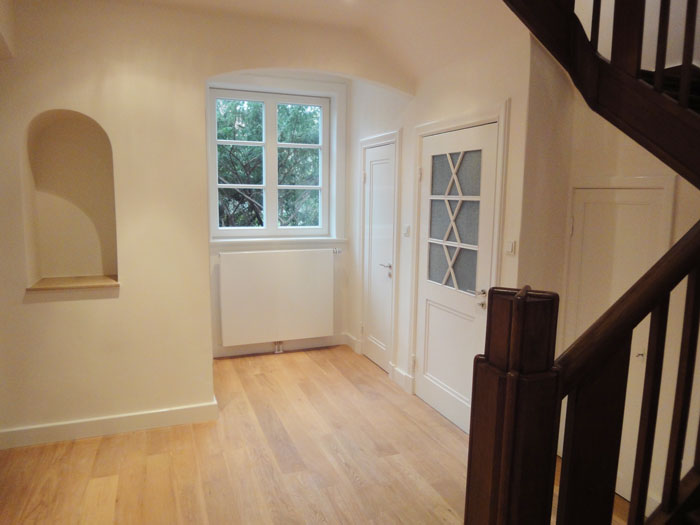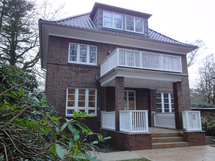 Dieses Gebäude wurde in allen Wohngeschossen totalsaniert. Nach alten Fotos haben wir die Fenster nachgebaut, allerdings mit 90 mm dicken Rahmen und U-Werten um 0,92 W/m²K und Balkone und Terrassen mit weissen Holzgeländern versehen.