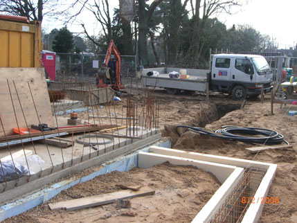 Man kann jetzt erkennen, wie groß das Haus wirklich wird. Vorne wird gerade das Fundament für den kleinen Anbau im Wohnzimmer warm eingepackt. Dahinter ist ein Graben mit dem kleinen Bagger ausgehoben worden, alles für die restlichen Fundamente. Durch die spitzen Eisen, die vorne in die Luft ragen, werden alle Fundamente später miteinander fest verbunden.