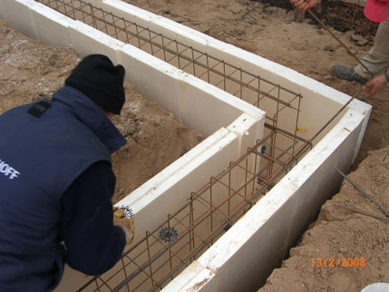 Herr Rösner verdrahtet gerade die Eisen für des Fundament miteinander, rundherum kann man schön sehen, wie warm die Mauern in der Erde stehen. Bald wird Beton in die Zwischenräume geschüttet.