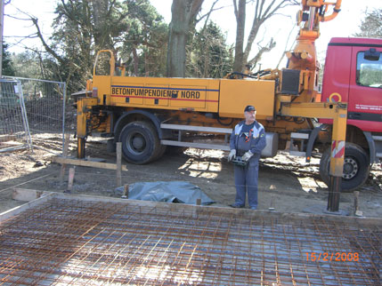 Endlich geschafft! Alle Eisen liegen. Die Pumpe ist schon da, der Betonmischer kommt auch gleich! Mit einer Fernbedienung wird die Betonmenge, die dann durch die Pumpe auf das Eisen fließt, gesteuert.