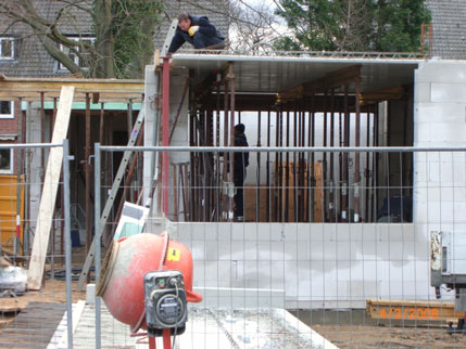 Die Wände des Erdgeschosses sind fertig gemauert und für die Decke zur 1. Etage wurden die Fertigbetonteile geliefert, auf diese wird wieder die Decke geschüttet. In den Räumen sind Stahlstützen aufgebaut, die den Beton halten, bis er getrocknet ist.