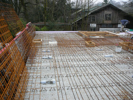 Jetzt wächst das Haus, die Vorbereitungen für die Schüttung der Decke der 1. Etage laufen. Wieder wird viel Eisen für die Stabilität verlegt, hinten rechts ist die Aussparung für die Treppe zu erkennen.