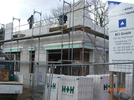 Das Gerüst ist aufgebaut worden, das Haus ist inzwischen so hoch, dass die Bauarbeiter so sicherer arbeiten können.