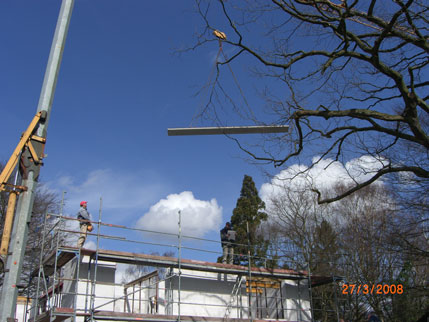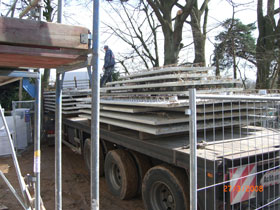 Der LKW bringt weitere Deckenplatten. Mit dem Kran werden die einzelnen Platten auf das Mauerwerk gelegt und heute Nachmittag mit Beton vollgeschüttet. Die oberste Decke ist dann fertig.