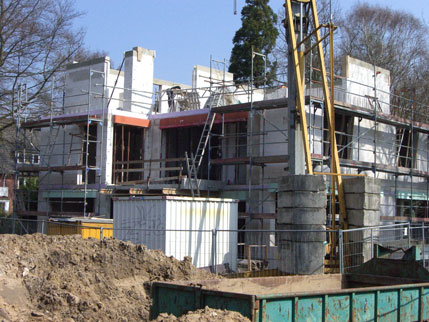 Ganz oben könnt ihr Herrn Rösner sehen, er arbeitet schon über euren Kinderzimmern, im Geschoß eurer Eltern. Man kann jetzt auch die Treppen benutzen und so vom Keller bis nach ganz oben gehen.