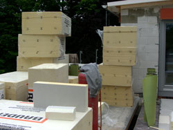 Jetzt werden die 38cm dicken Wärmedämmplatten auf die Betondecke der Dachterrasse verlegt, damit die darunterliegenden Kinderzimmer schön warm bleiben.