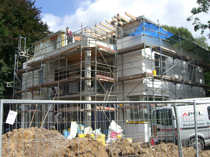 Tagelang hat es geregnet, das Haus ist mit Plastikplanen geschützt. Herr Apel steht auf der Dachterrasse und telefoniert - endlich scheint die Sonne!