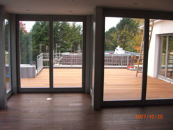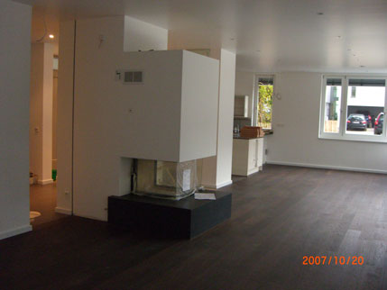 Links ist der fast fertige Wohnraum zu sehen, die Küche wird gerade eingebaut. (Der Boden hat gerade keine Kratzer)